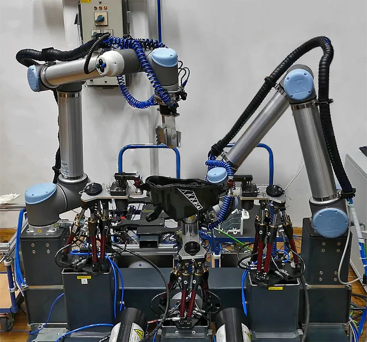 The reconfigurable robot workcell in a configuration where it assembles an automotive headlight.