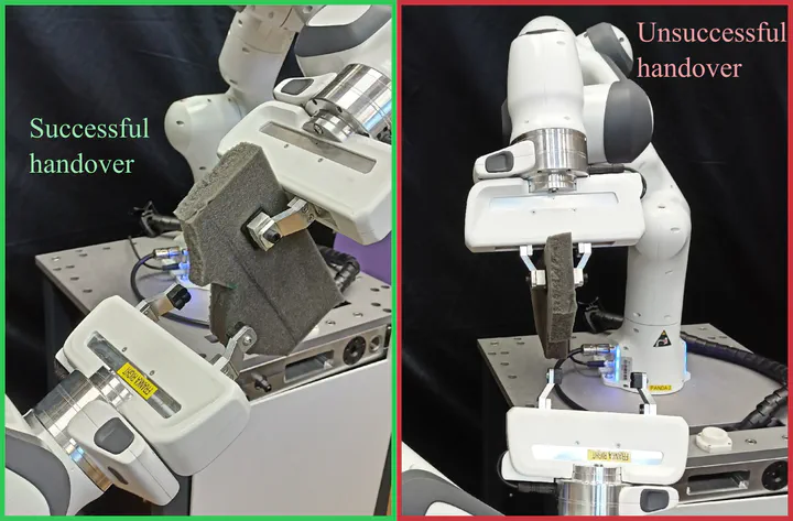 An example of a successful and an unsuccessful attempt of a robot-to-robot object handover, implemented using RIMEDNet.
