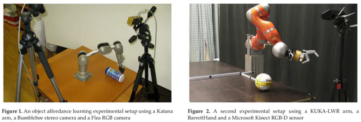 Continuous learning of object affordances in a cognitive robot is a challenging problem, the solution to which arguably requires a developmental approach. In this paper, we describe scenarios where robotic systems interact with household objects by pushing them using robot arms while observing the scene with cameras, and which must incrementally learn, without external supervision, both the effect classes that emerge from these interactions as well as a discriminative model for predicting them from object properties. We formalize the scenario as a multi-view learning problem where data co-occur over two separate data views over time, and we present an online learning framework that uses a self-supervised form of learning vector quantization to build the discriminative model. In various experiments, we demonstrate the effectiveness of this approach in comparison with related supervised methods using data from experiments performed using two different robotic platforms.