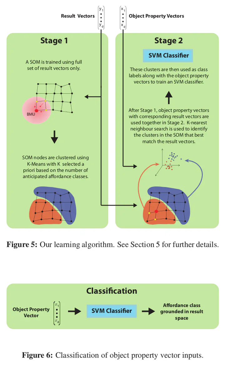 Affordance learning has, in recent years, been generating heightened interest in both the cognitive vision and developmental robotics communities. In this paper we describe the development of a system that uses a robotic arm to interact with household objects on a table surface while observing the interactions using camera systems. Various computer vision methods are used to derive, firstly, object property features from intensity images and range data gathered before interaction and, subsequently, result features derived from video sequences gathered during and after interaction. We propose a novel affordance learning algorithm that automatically discretizes the result feature space in an unsupervised manner to form affordance classes that are then used as labels to train a supervised classifier in the object property feature space. This classifier may then be used to predict affordance classes, grounded in the result space, of novel objects based on object property observations.