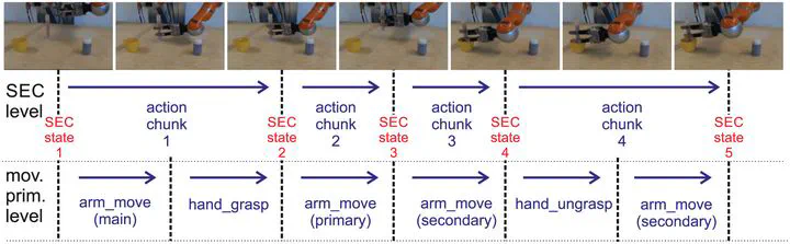 Temporal action structuring at two different hierarchical levels: semantic event chain (SEC) and movement primitives (mov. prim.).Abstract