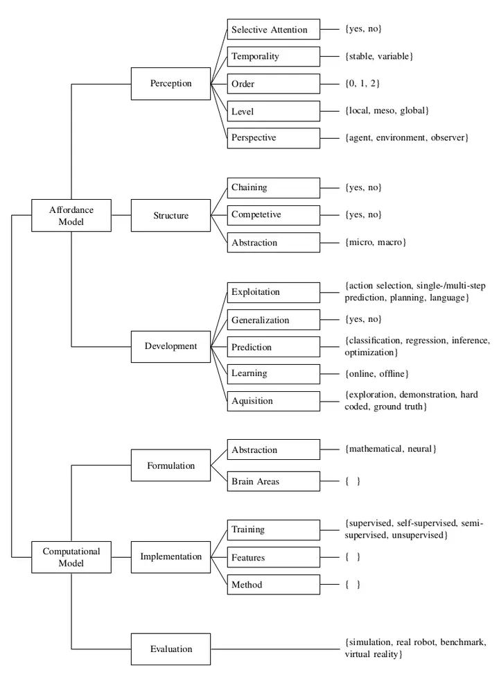 Overview of our taxonomy for classifying computational models of affordances in robotics.