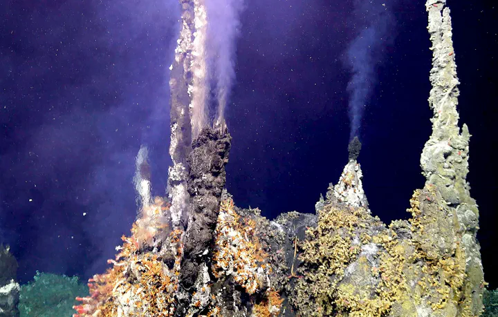 Inferno Summit: Actively venting ’chimlets’ atop the hydrothermal edifice called Inferno in the ASHES Hydrothermal Field on the summit of Axial Seamount (~1500 m water depth). Image: InVADER Mission Website, Credit. D. Kelley, University of Washington/NSF-OOI/WHOI..InVADER Mission